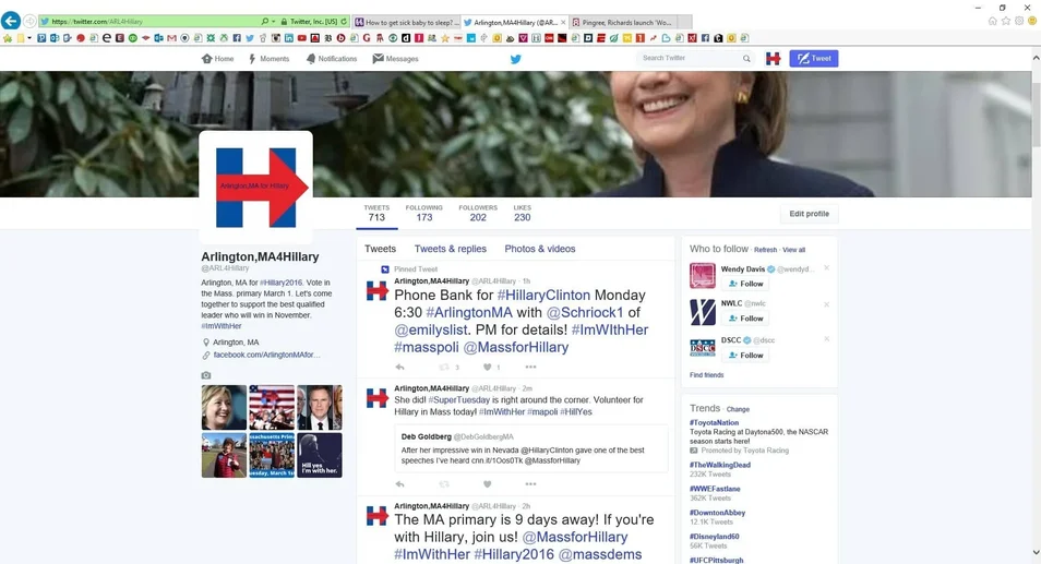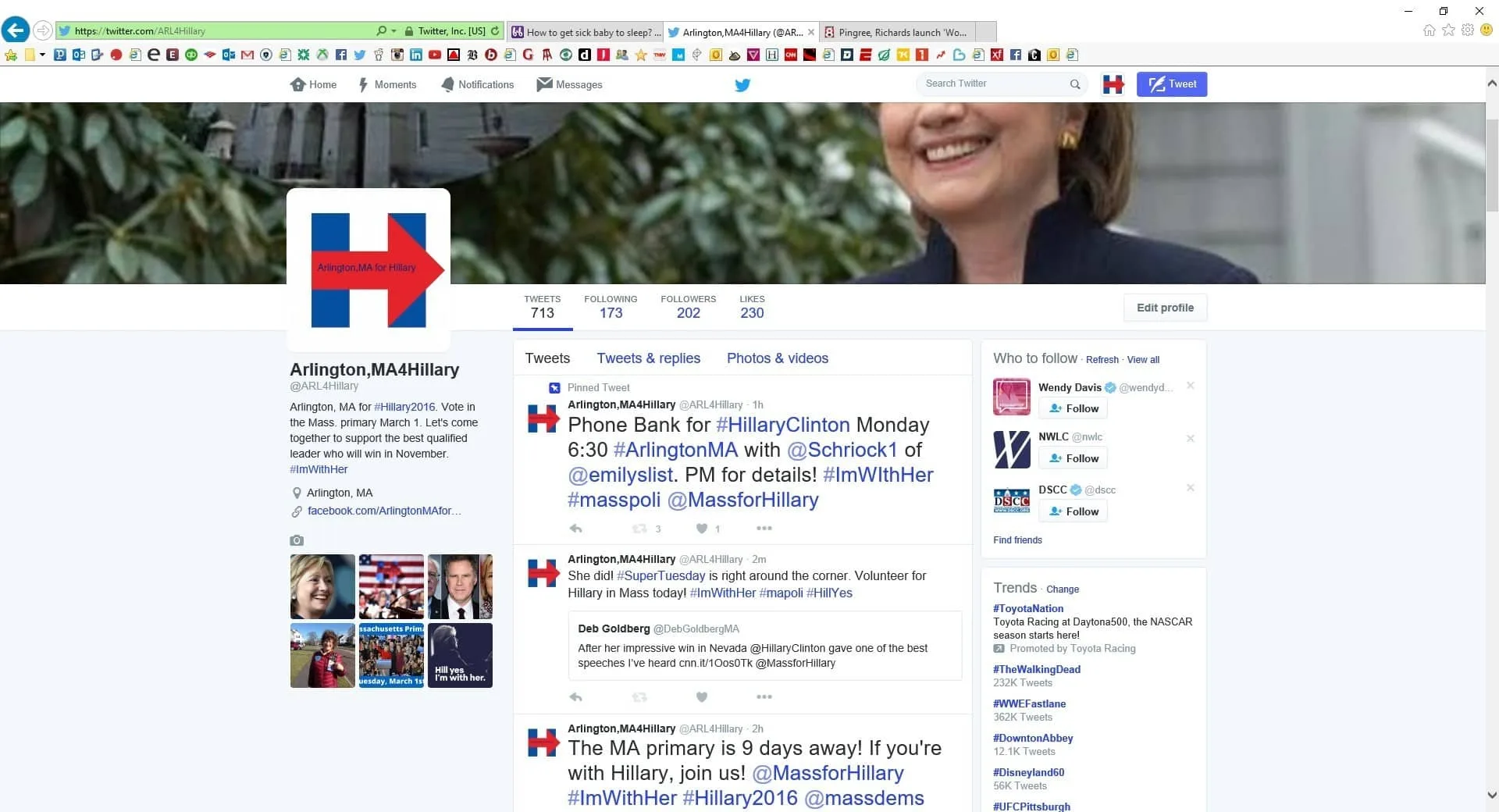 I’m currently the Social Media Manager for the Arlington for Hillary Clinton Twitter account. I manage the design, photos, logo, favorites, retweets (RT), and 95% of the tweets. Using Twitter Analytics, I tracked my early progress in growing the account.