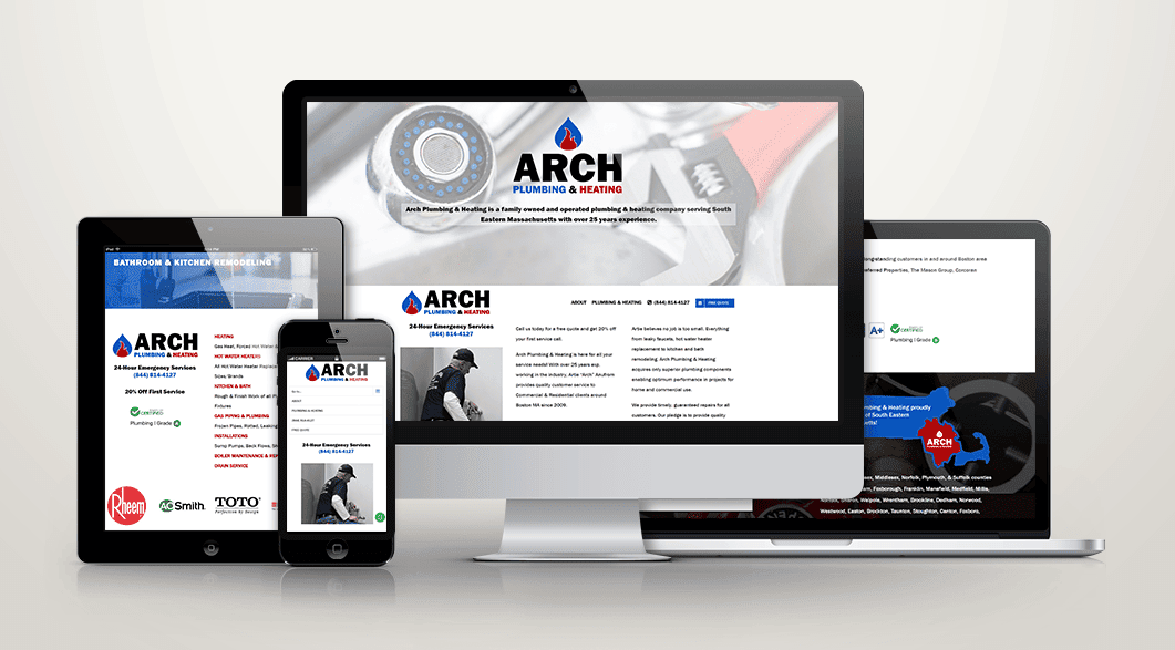 The Arch Plumbing & Heating site design is a hybrid desktop/mobile experience on WordPress. It features easy access contact options with a modern design that looks good on all devices. Be sure to check it out at archplumbingandheating.info on your mobile device for the full experience.
